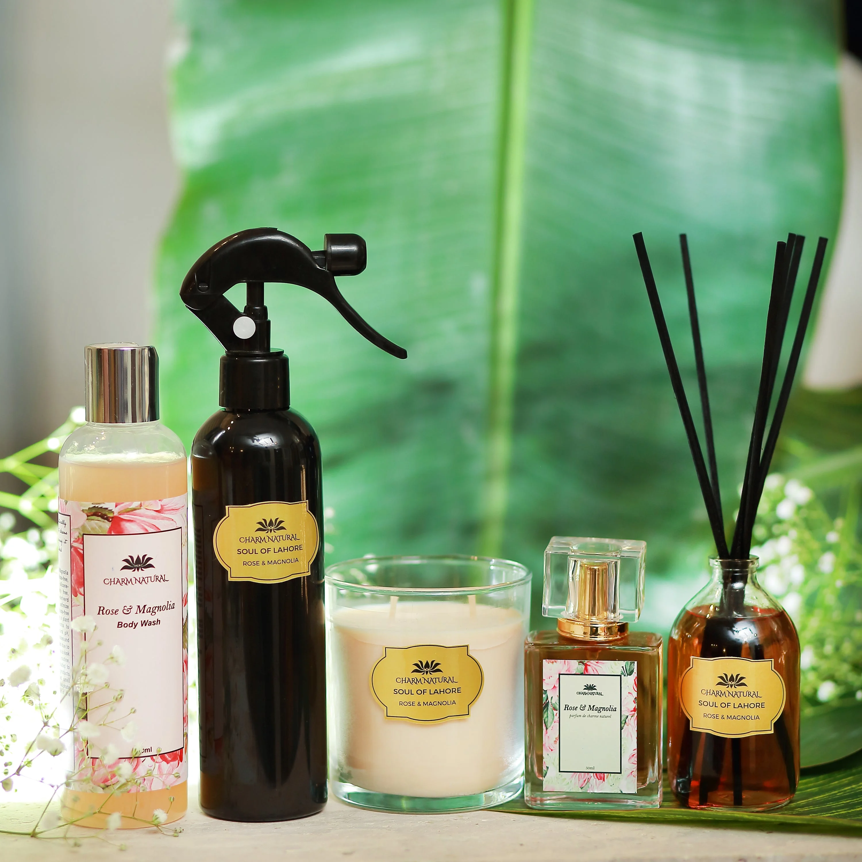 Gift someone the essence of luxury with the Rose & Magnolia Garden Bundle. This exquisite set includes a beautifully scented Rose & Magnolia Candle, a continuous Rose & Magnolia Reed Diffuser, and a refreshing Rose & Magnolia Room & Linen Mist. Complemented by a pampering Rose & Magnolia Body