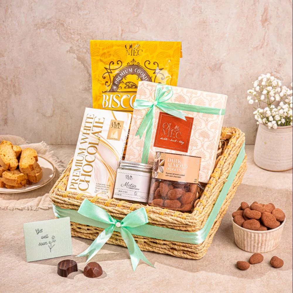 A feel-good hamper made to send love and care. Includes a Heritage Box of 9, creamy white chocolate bar, crunchy biscotti, rich dark almond dragees, and a calming Motia candle. A beautiful, reusable basket — ideal for re-gifting or personal use.