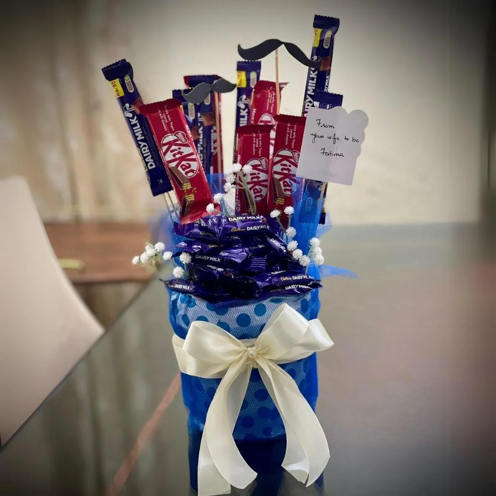 A stunning arrangement of rich chocolates beautifully wrapped in elegant blue hues. This luxurious bouquet combines indulgence and style, making it a perfect gift for any special occasion or a delightful treat for someone who loves the finer things in life.