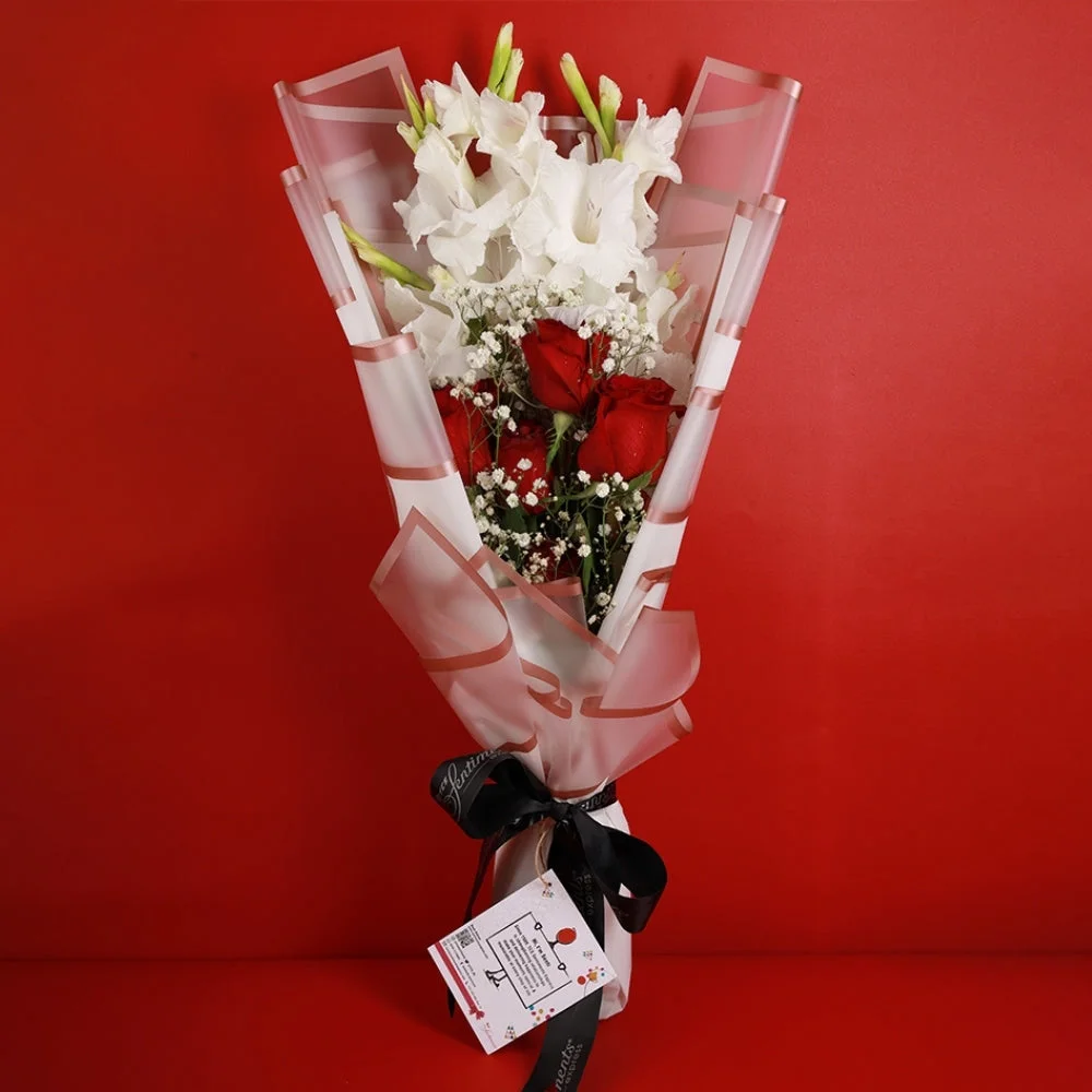 Lavish Bouquet is the absolute deal to make your day special with your lucky beloved person. Local Red Roses, Stems of White Glad, Stems of Gypso, wrapped in White Rice Paper, what else one could ask for.