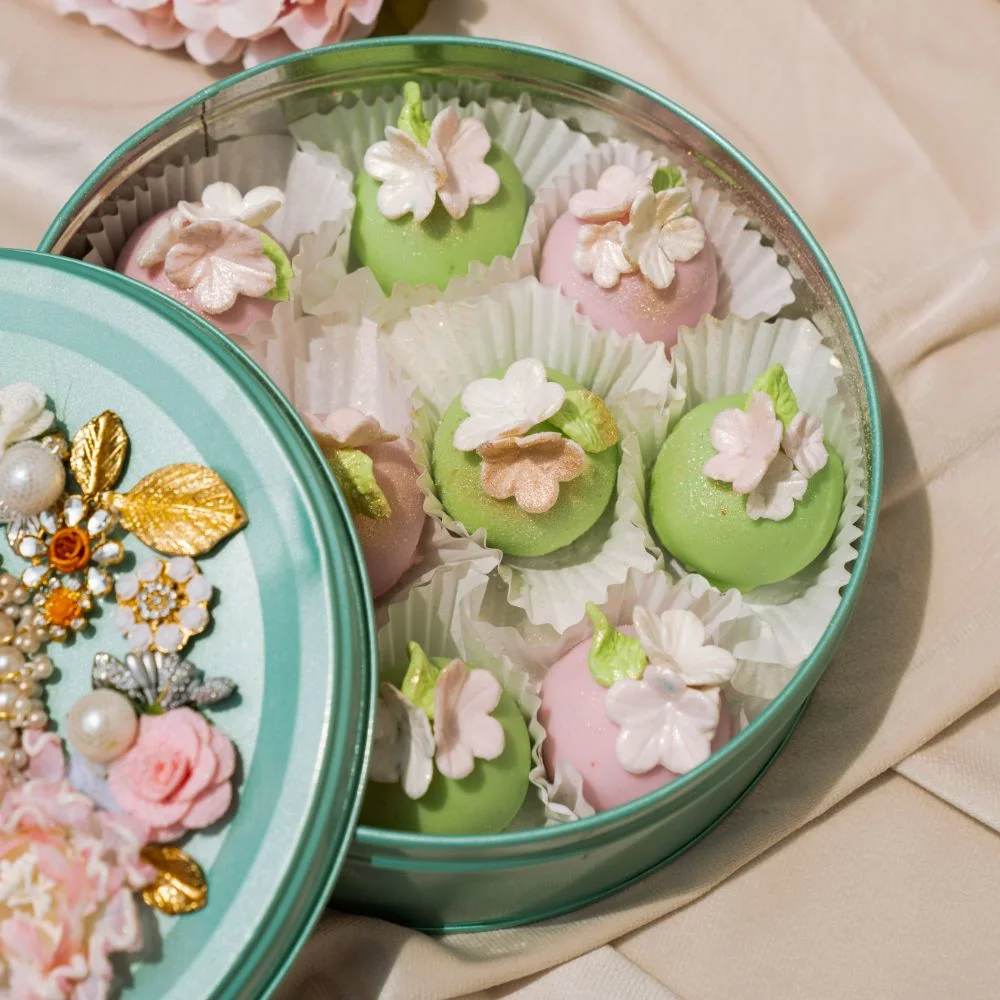 An age old classic pistachiocolored tin box filled with nutty choc andFrench vanilla white choc crunch cake pops.Decorated on the colors of the tin.