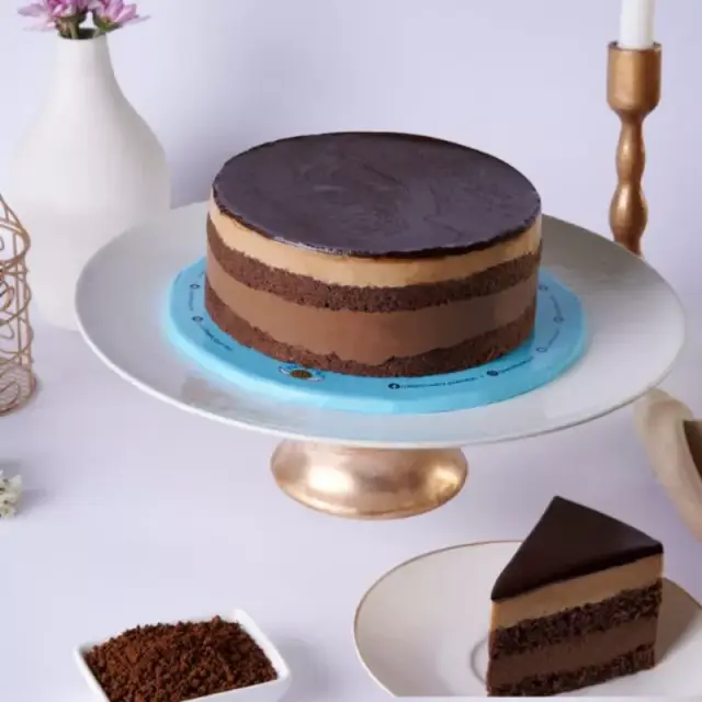 Layers of chocolate mousse, Coffee mousse with two layers of light chocolate cake topped with dark chocolate ganache. Size: 2 Pounds Useful Ordering Info: Same