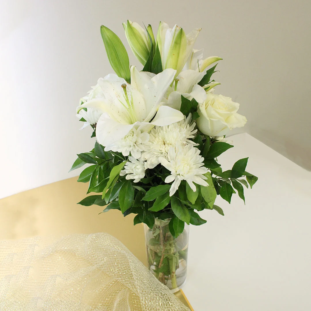 An arrangement of pure beauty designed in a beautiful keepsake vase with Chrysanthemums, roses and white lilies. These flowers are like a breath of fresh air on any occasion.
