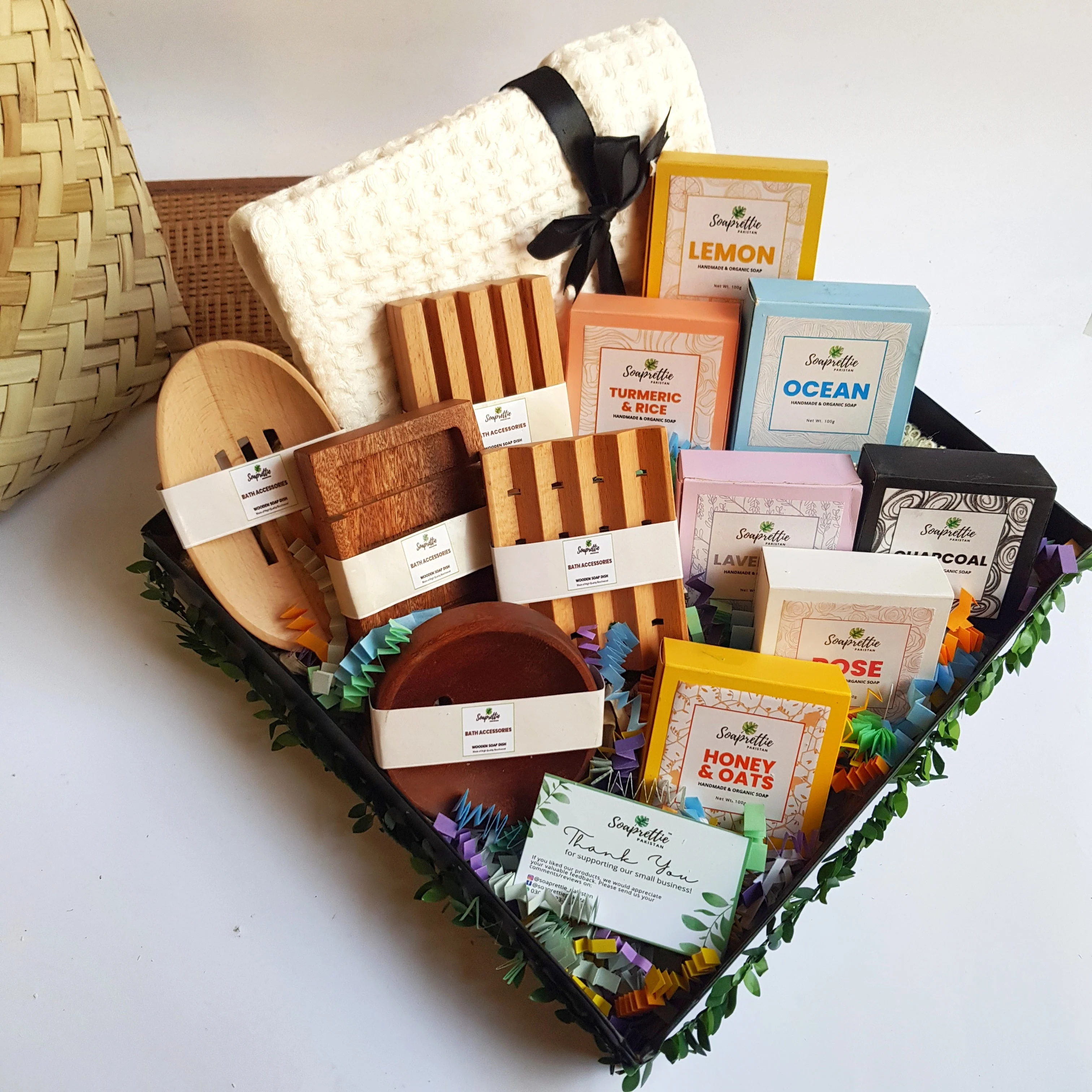 Includes 7 handmade soaps, waffle towel, 5 soap dishes. It comes in a Black Gift box.