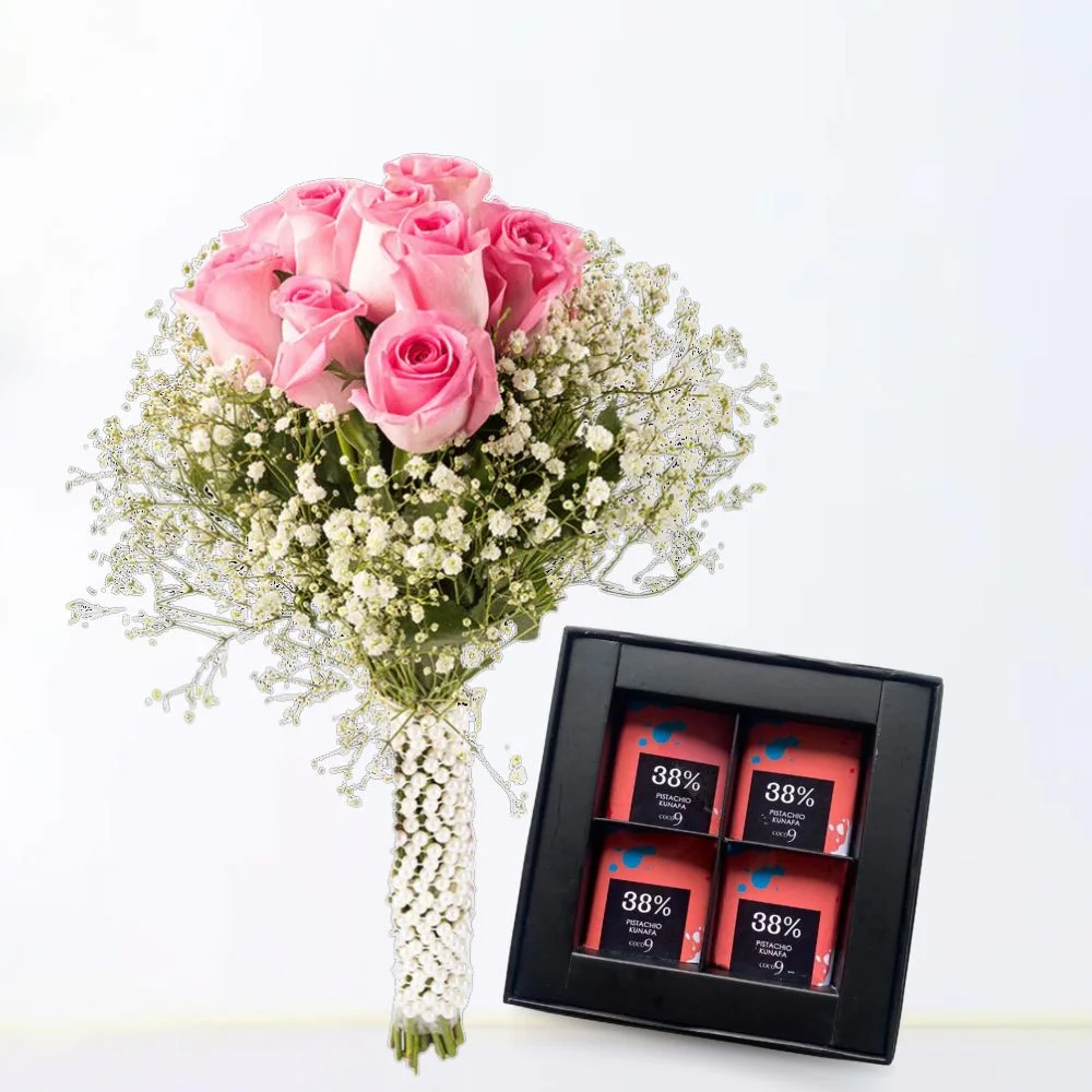A vibrant arrangement of pink roses with delicate baby’s breath, paired with a sleek black box of four Pistachio Kunafa Bars.