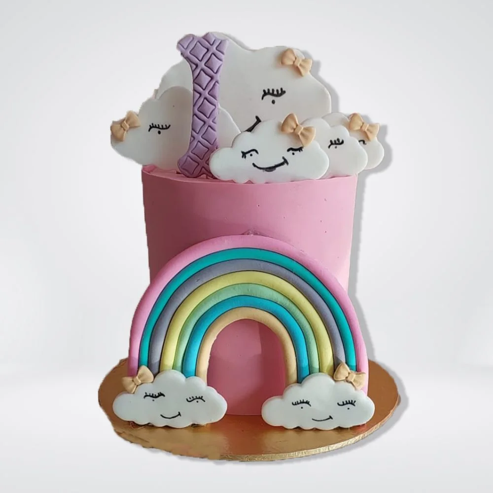 Our signature American buttercream cake, Layered with vanilla and chocolate sponge, decorated with fondant rainbow elements. This cutie is perfect to make anyone smile. So much happiness in one cake!