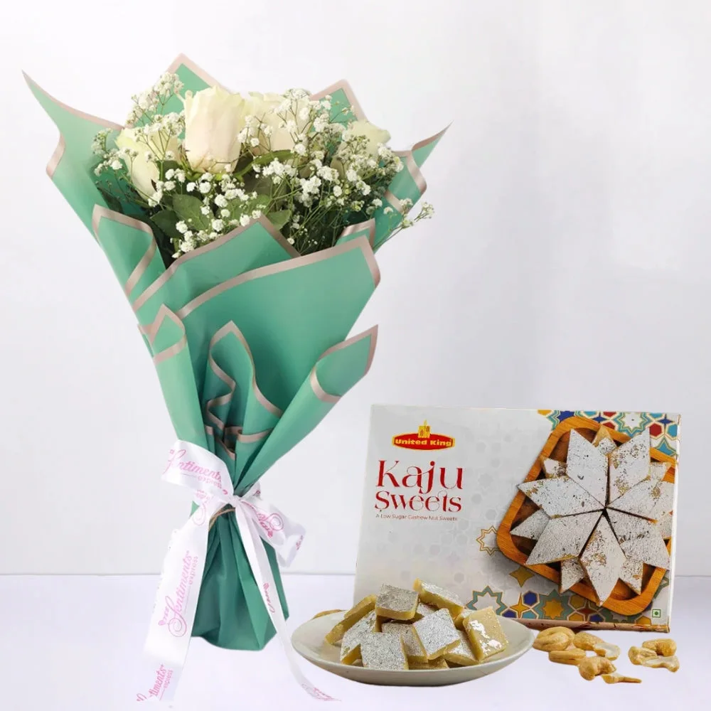 Celebrate with sophistication and sweetness through Kaju Sweet paired with an Elegant Bouquet of White Roses. This exquisite combination blends the rich, nutty flavor of Kaju Sweet with the pure beauty of white roses, offering a refined gift that radiates grace and indulgence for any special occasion.
