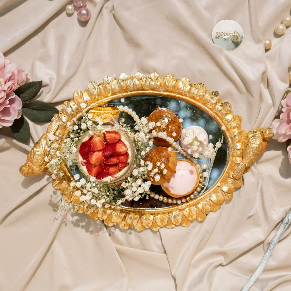 Beautiful gold and glass tray witha crystal jar with French vanilla strawberrydessert accompanied by donuts eclairs andcake pops.
