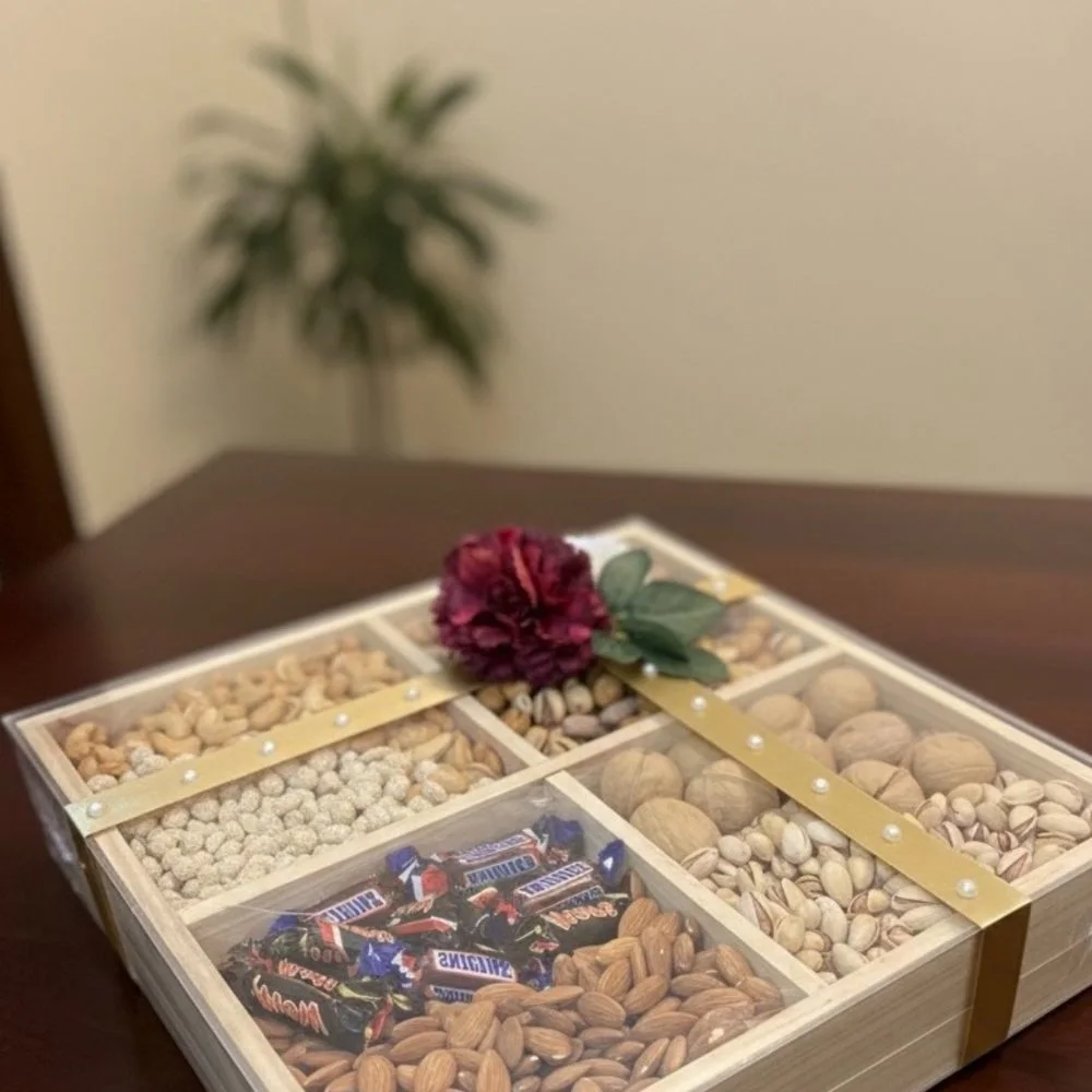Cashew Nuts, Pistachios, Almonds, Walnuts, Raisins, Mixed nuts, Snickers, Mars, in decorticated wooden tray – Select your ideal presentation from 3 available sizes. We ensure a perfectly balanced gift by adjusting the quantity of dry fruits and chocolates to match the size of the tray you choose. Please be aware tha